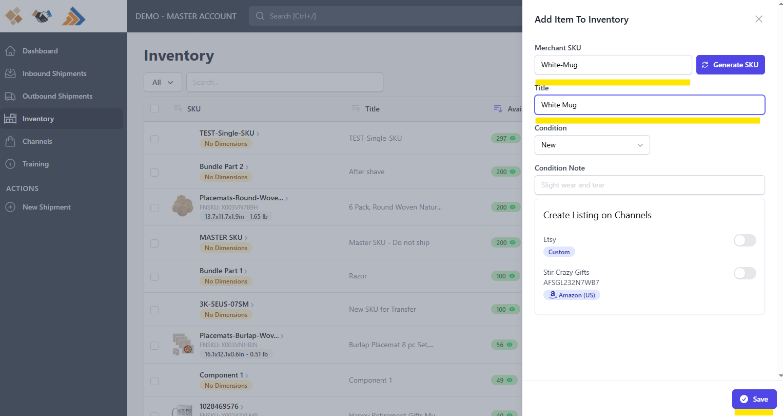 Enter the Merchant SKU and Title, then click Save.