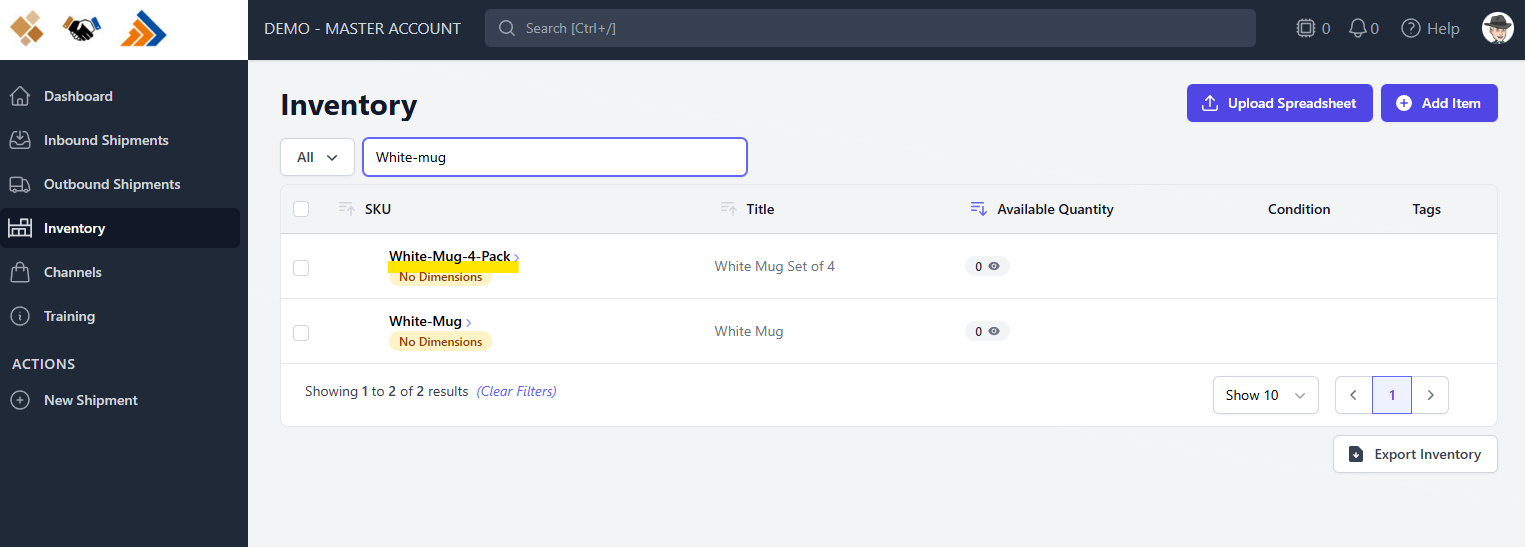 For this example, select White Mug Set of 4. This opens the Inventory Detail screen for that SKU.