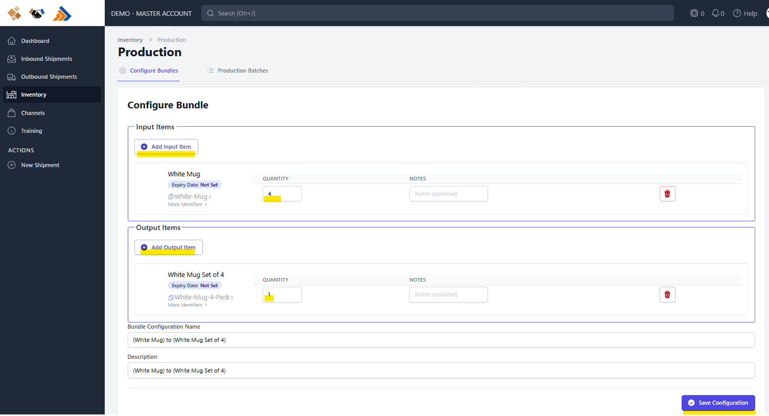 Example: If the bundle includes 4 mugs, set the White Mug input quantity to 4.