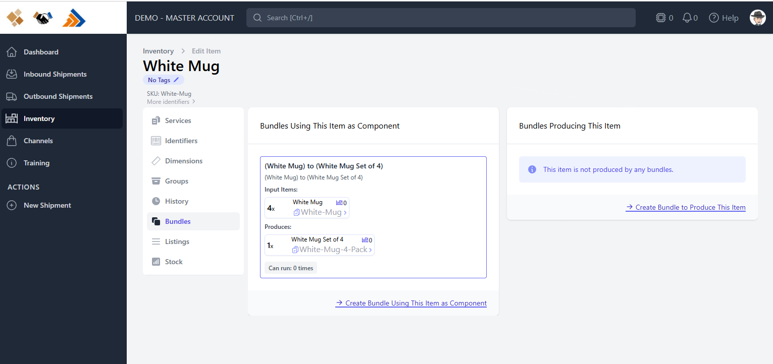 Bundles let you track a “finished” SKU (the bundle) that’s composed of multiple “component” SKUs (the individual items it contains). In the Portal, you link components to a bundle by creating a bundle relationship on the Bundles tab of an inventory item.